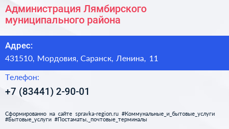 Администрация Лямбирского муниципального района по адресу 431510, Мордовия, Саранск, Ленина, 11 в дальнейшем Организация, размещена в следующих категориях: