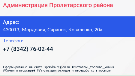 Администрация Пролетарского района по адресу 430013, Мордовия, Саранск, Коваленко, 20а в дальнейшем Организация, размещена в следующих категориях: