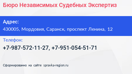 Бюро Независимых Судебных Экспертиз по адресу 430005, Мордовия, Саранск, проспект Ленина, 12 в дальнейшем Организация, размещена в следующих категориях: