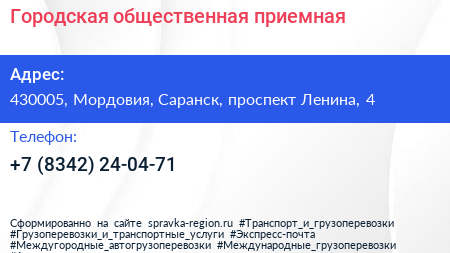 Городская общественная приемная по адресу 430005, Мордовия, Саранск, проспект Ленина, 4 в дальнейшем Организация, размещена в следующих категориях: