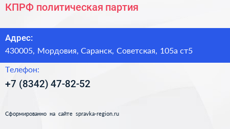 КПРФ, политическая партия по адресу 430005, Мордовия, Саранск, Советская, 105а ст5 в дальнейшем Организация, размещена в следующих категориях:
