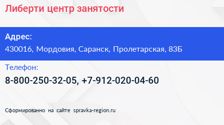 Либерти, центр занятости по адресу 430016, Мордовия, Саранск, Пролетарская, 83Б в дальнейшем Организация, размещена в следующих категориях: