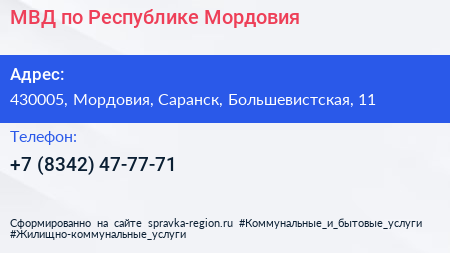 МВД по Республике Мордовия по адресу 430005, Мордовия, Саранск, Большевистская, 11 в дальнейшем Организация, размещена в следующих категориях: