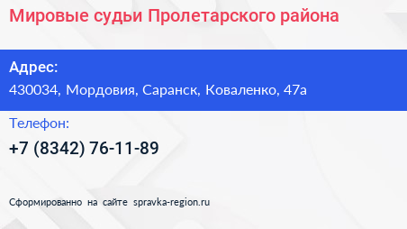 Мировые судьи Пролетарского района по адресу 430034, Мордовия, Саранск, Коваленко, 47а в дальнейшем Организация, размещена в следующих категориях: