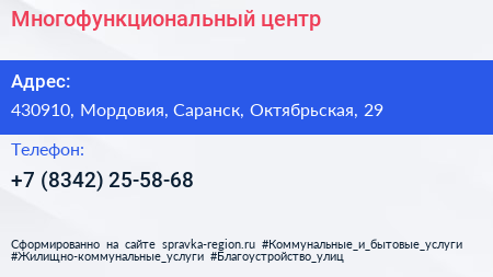Многофункциональный центр по адресу 430910, Мордовия, Саранск, Октябрьская, 29 в дальнейшем Организация, размещена в следующих категориях:
