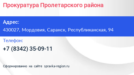 Прокуратура Пролетарского района по адресу 430027, Мордовия, Саранск, Республиканская, 94 в дальнейшем Организация, размещена в следующих категориях: