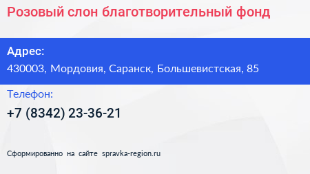 Розовый слон, благотворительный фонд по адресу 430003, Мордовия, Саранск, Большевистская, 85 в дальнейшем Организация, размещена в следующих категориях: