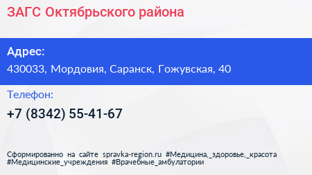 ЗАГС Октябрьского района по адресу 430033, Мордовия, Саранск, Гожувская, 40 в дальнейшем Организация, размещена в следующих категориях: