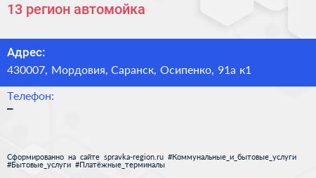 13 регион, автомойка по адресу 430007, Мордовия, Саранск, Осипенко, 91а к1 в дальнейшем Организация, размещена в следующих категориях: