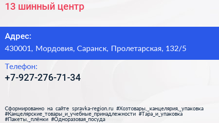 13, шинный центр по адресу 430001, Мордовия, Саранск, Пролетарская, 132/5 в дальнейшем Организация, размещена в следующих категориях: