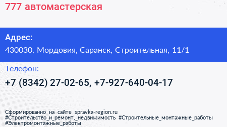777, автомастерская по адресу 430030, Мордовия, Саранск, Строительная, 11/1 в дальнейшем Организация, размещена в следующих категориях: