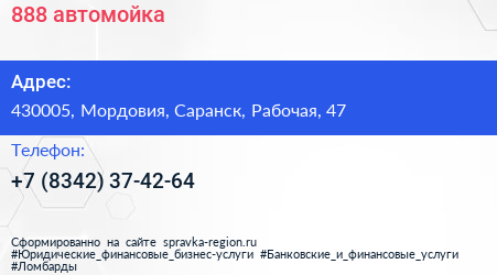 888, автомойка по адресу 430005, Мордовия, Саранск, Рабочая, 47 в дальнейшем Организация, размещена в следующих категориях:
