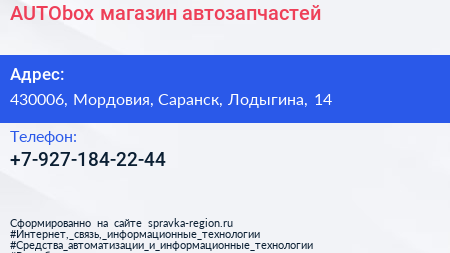 AUTObox, магазин автозапчастей по адресу 430006, Мордовия, Саранск, Лодыгина, 14 в дальнейшем Организация, размещена в следующих категориях: