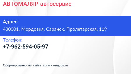 АВТОМАЛЯР, автосервис по адресу 430001, Мордовия, Саранск, Пролетарская, 119 в дальнейшем Организация, размещена в следующих категориях: