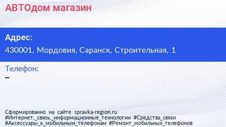 АВТОдом, магазин по адресу 430001, Мордовия, Саранск, Строительная, 1 в дальнейшем Организация, размещена в следующих категориях: