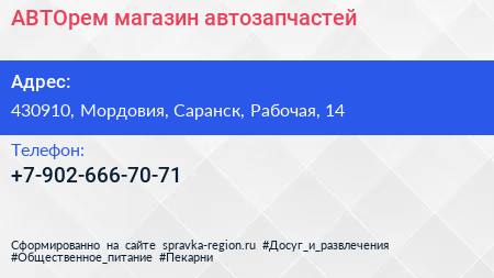 АВТОрем, магазин автозапчастей по адресу 430910, Мордовия, Саранск, Рабочая, 14 в дальнейшем Организация, размещена в следующих категориях: