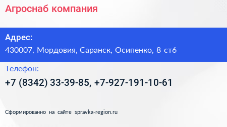 Агроснаб, компания по адресу 430007, Мордовия, Саранск, Осипенко, 8 ст6 в дальнейшем Организация, размещена в следующих категориях: