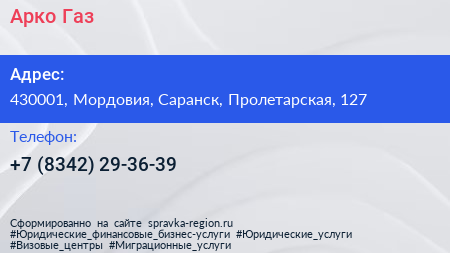 Арко-Газ по адресу 430001, Мордовия, Саранск, Пролетарская, 127 в дальнейшем Организация, размещена в следующих категориях: