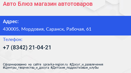 Авто Блюз, магазин автотоваров по адресу 430005, Мордовия, Саранск, Рабочая, 61 в дальнейшем Организация, размещена в следующих категориях: