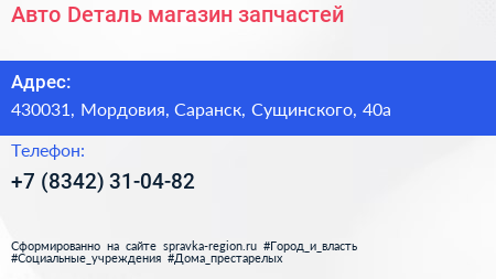 Авто-Dеталь, магазин запчастей по адресу 430031, Мордовия, Саранск, Сущинского, 40а в дальнейшем Организация, размещена в следующих категориях: