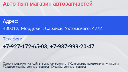 Авто тыл, магазин автозапчастей по адресу 430012, Мордовия, Саранск, Ухтомского, 47/2 в дальнейшем Организация, размещена в следующих категориях: