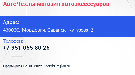 АвтоЧехлы, магазин автоаксессуаров по адресу 430030, Мордовия, Саранск, Кутузова, 2 в дальнейшем Организация, размещена в следующих категориях: