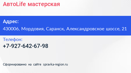 АвтоLife, мастерская по адресу 430006, Мордовия, Саранск, Александровское шоссе, 21 в дальнейшем Организация, размещена в следующих категориях: