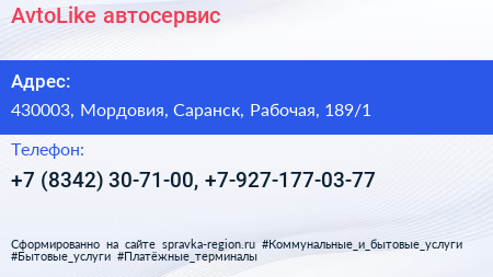AvtoLike, автосервис по адресу 430003, Мордовия, Саранск, Рабочая, 189/1 в дальнейшем Организация, размещена в следующих категориях: