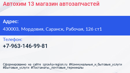 Автохим 13, магазин автозапчастей по адресу 430003, Мордовия, Саранск, Рабочая, 126 ст1 в дальнейшем Организация, размещена в следующих категориях: