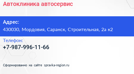 Автоклиника, автосервис по адресу 430030, Мордовия, Саранск, Строительная, 2а к2 в дальнейшем Организация, размещена в следующих категориях: