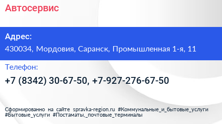 Автосервис по адресу 430034, Мордовия, Саранск, Промышленная 1-я, 11 в дальнейшем Организация, размещена в следующих категориях: