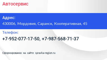 Автосервис по адресу 430006, Мордовия, Саранск, Кооперативная, 45 в дальнейшем Организация, размещена в следующих категориях: