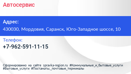 Автосервис по адресу 430030, Мордовия, Саранск, Юго-Западное шоссе, 10 в дальнейшем Организация, размещена в следующих категориях: