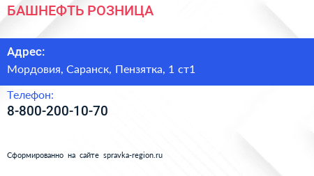 БАШНЕФТЬ-РОЗНИЦА по адресу Мордовия, Саранск, Пензятка, 1 ст1 в дальнейшем Организация, размещена в следующих категориях: