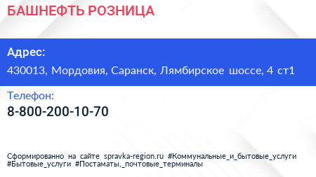 БАШНЕФТЬ-РОЗНИЦА по адресу 430013, Мордовия, Саранск, Лямбирское шоссе, 4 ст1 в дальнейшем Организация, размещена в следующих категориях: