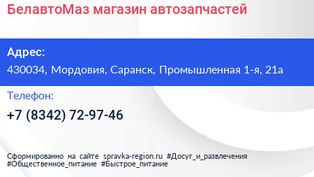 БелавтоМаз, магазин автозапчастей по адресу 430034, Мордовия, Саранск, Промышленная 1-я, 21а в дальнейшем Организация, размещена в следующих категориях: