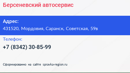Берсеневский, автосервис по адресу 431520, Мордовия, Саранск, Советская, 59в в дальнейшем Организация, размещена в следующих категориях: