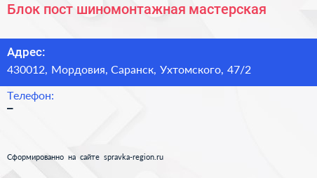 Блок-пост, шиномонтажная мастерская по адресу 430012, Мордовия, Саранск, Ухтомского, 47/2 в дальнейшем Организация, размещена в следующих категориях:
