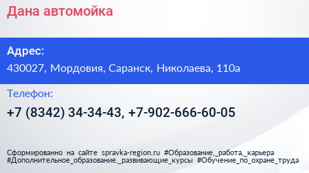 Дана, автомойка по адресу 430027, Мордовия, Саранск, Николаева, 110а в дальнейшем Организация, размещена в следующих категориях: