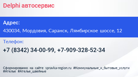 Delphi, автосервис по адресу 430034, Мордовия, Саранск, Лямбирское шоссе, 12 в дальнейшем Организация, размещена в следующих категориях: