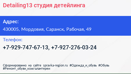 Detailing13, студия детейлинга по адресу 430005, Мордовия, Саранск, Рабочая, 49 в дальнейшем Организация, размещена в следующих категориях: