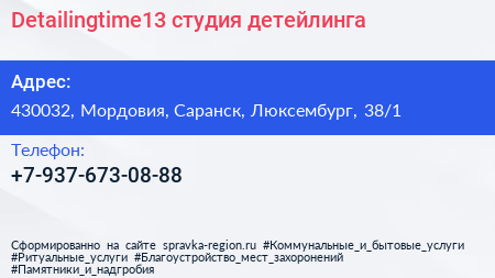 Detailingtime13, студия детейлинга по адресу 430032, Мордовия, Саранск, Люксембург, 38/1 в дальнейшем Организация, размещена в следующих категориях: