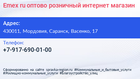 Emex.ru, оптово-розничный интернет-магазин по адресу 430011, Мордовия, Саранск, Васенко, 17 в дальнейшем Организация, размещена в следующих категориях: