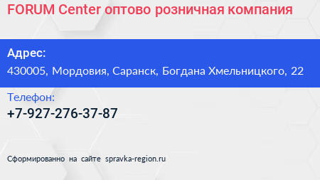 FORUM-Center, оптово-розничная компания по адресу 430005, Мордовия, Саранск, Богдана Хмельницкого, 22 в дальнейшем Организация, размещена в следующих категориях: