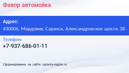 Фавор, автомойка по адресу 430006, Мордовия, Саранск, Александровское шоссе, 3Б в дальнейшем Организация, размещена в следующих категориях:
