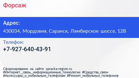 Форсаж по адресу 430034, Мордовия, Саранск, Лямбирское шоссе, 12В в дальнейшем Организация, размещена в следующих категориях: