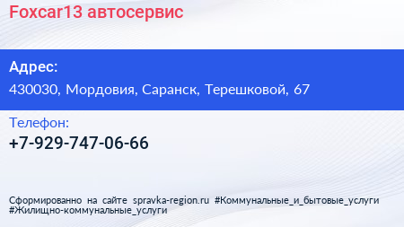 Foxcar13, автосервис по адресу 430030, Мордовия, Саранск, Терешковой, 67 в дальнейшем Организация, размещена в следующих категориях: