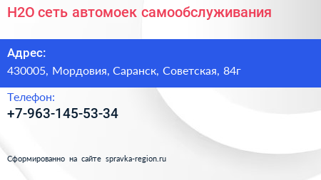 H2O, сеть автомоек самообслуживания по адресу 430005, Мордовия, Саранск, Советская, 84г в дальнейшем Организация, размещена в следующих категориях: