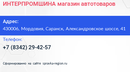 ИНТЕРПРОМШИНА, магазин автотоваров по адресу 430006, Мордовия, Саранск, Александровское шоссе, 41 в дальнейшем Организация, размещена в следующих категориях: