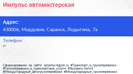 Импульс, автомастерская по адресу 430006, Мордовия, Саранск, Лодыгина, 7а в дальнейшем Организация, размещена в следующих категориях: